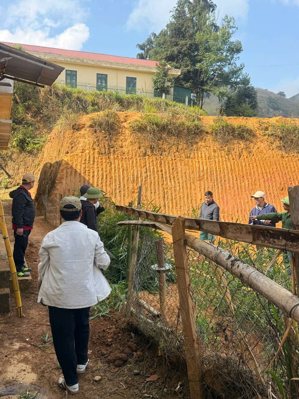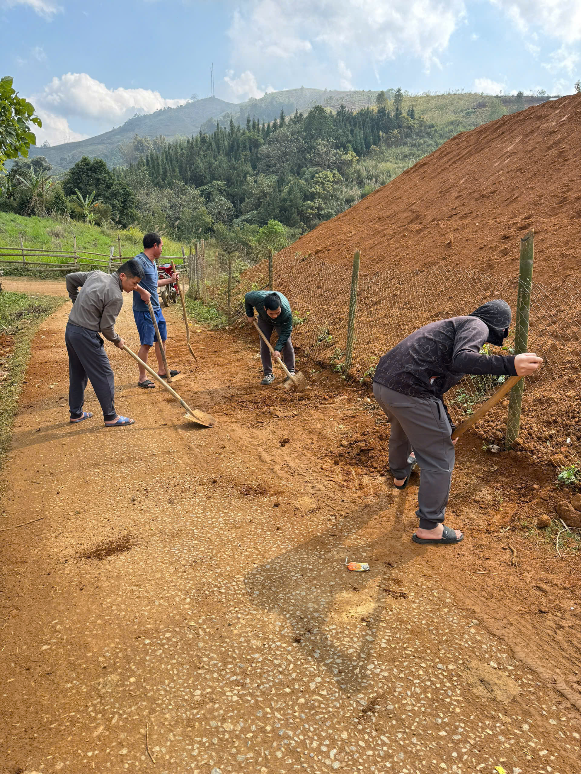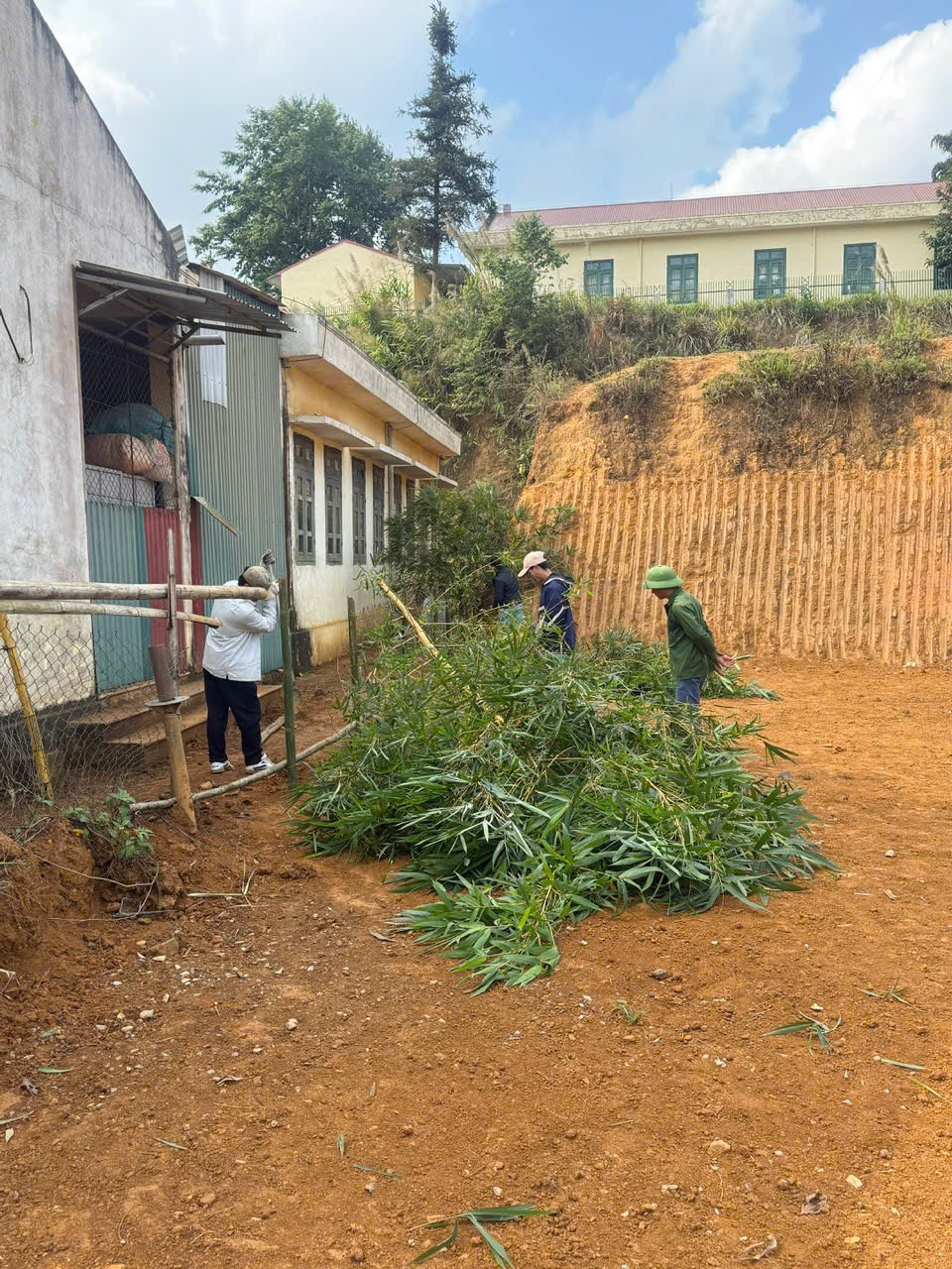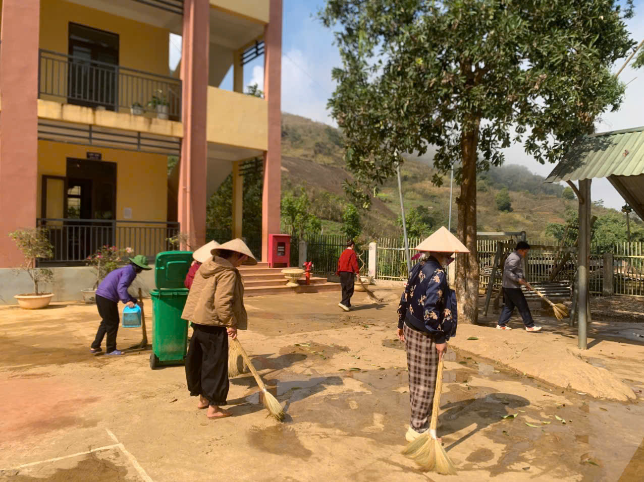 Ngay từ sáng sớm, các thầy cô giáo đã có mặt đầy đủ, chia thành nhiều nhóm để thực hiện các phần việc cụ thể. Tại khu vực sân trường, lối đi và khu nhà lớp học, các thầy cô cùng nhau quét dọn, thu gom rác, rửa sân, làm sạch bồn hoa, hành lang, khu bán trú. Ở các khu vực ven taluy, đường nội bộ và khuôn viên phía sau trường, nhiều thầy cô tiến hành cuốc đất, san gạt mặt bằng, phát quang bụi rậm, chặt tỉa cây cối, thu gom cành lá khô, tạo cảnh quan gọn gàng, an toàn.